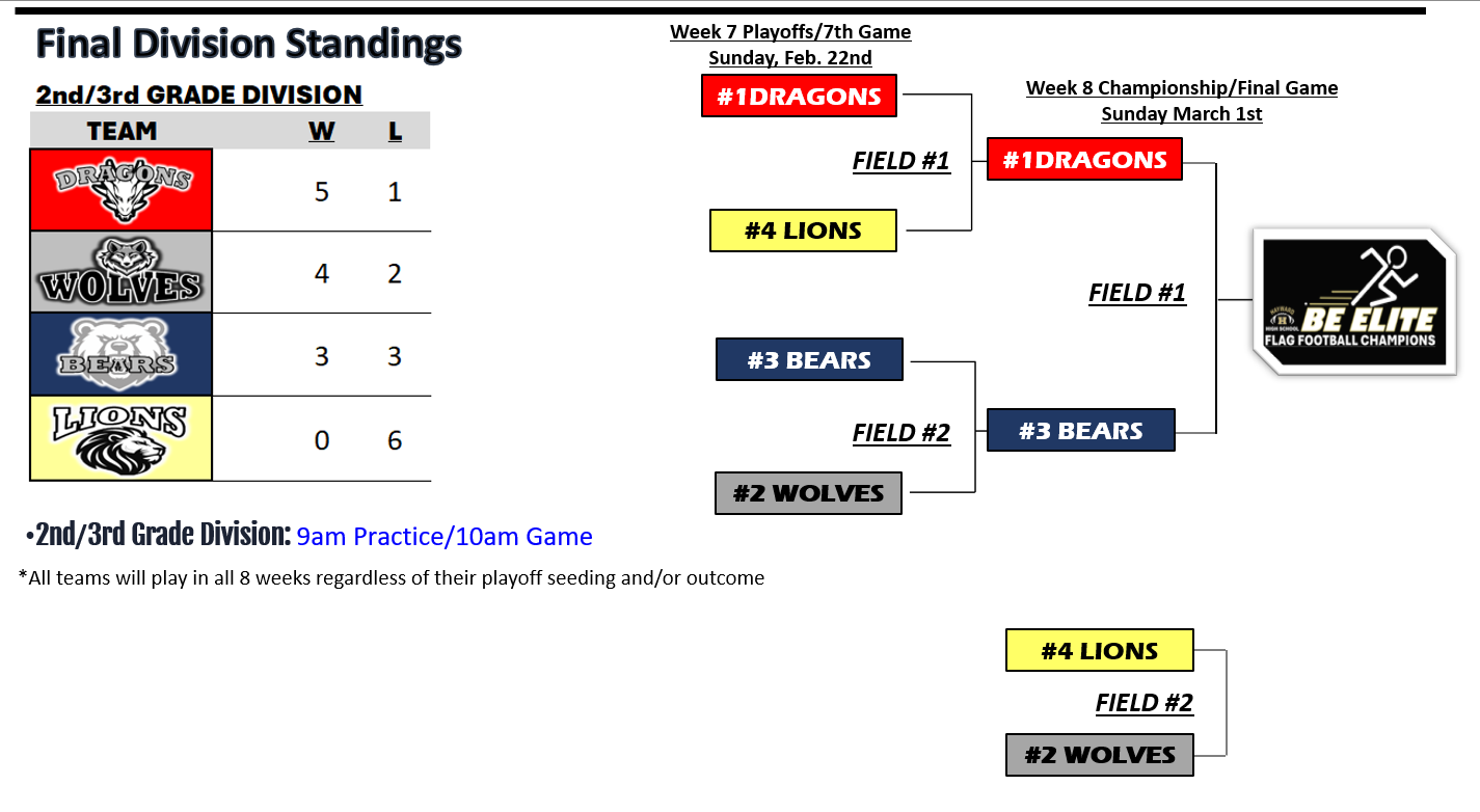2026 BE ELITE FLAG FOOTBALL HAYWARD HIGH SCHOOL 2nd/3rd Grade Division DIVISION STANDINGS/PLAYOFF BRACKETS