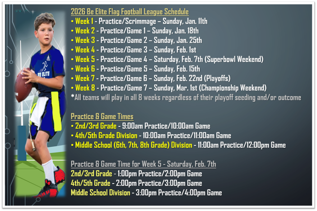 Practice and Game Schedule: All practices and games will be held on the SAME DAY – Each day will start with a one-hour practice followed by a game. Be Elite Flag Football is a parent friendly one stop shop schedule (no other practices will be scheduled during the week).